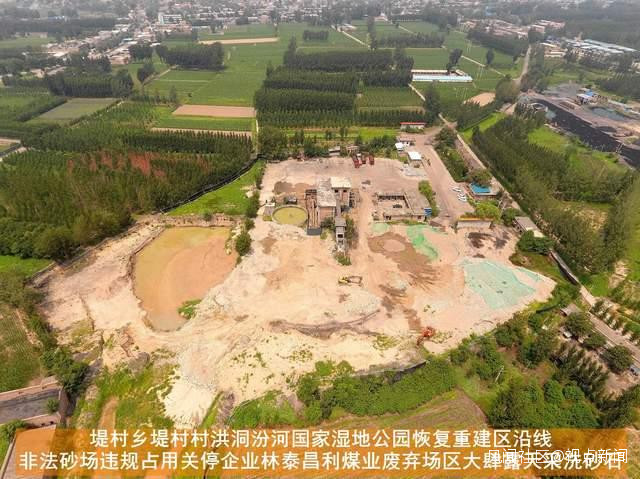 高空俯瞰,僅在堤村村長達一公里的汾河國家濕地公園沿線,以砂場和煤場為主的小散亂污就有大大小小多達七八處。在堤村村的汾河岸邊,一處佔地二三十畝的煤泥曬場內數台車輛正將上千噸的粉煤露天倒在空地上,大量洗煤廢水流入就地開挖的滲坑之內。在已關停的林泰昌利煤業公司,一台挖機正在就地採挖河砂,諾大的場區已被掘開巨大深坑,露天堆放着上萬噸的砂石。在慧然建材有限公司北側,一處佔地十餘畝的水洗砂場正在露天洗選砂石,洗砂廢水流入就地開挖的大型滲坑。觀察發現,正在非法生產的小散亂污均屬無工商登記、無項目審批、無環評許可的“三無”企業,並且全都地處洪洞汾河國家濕地公園恢復重建區沿線,有的距離汾河堤岸最近竟然僅有數米。