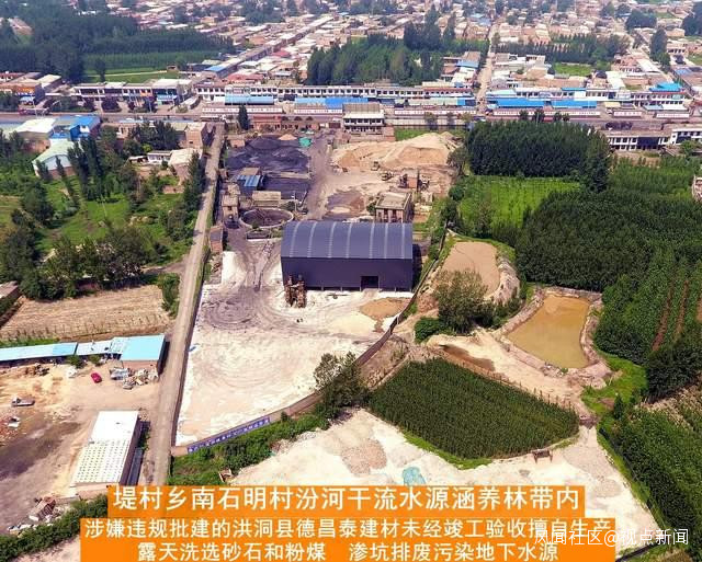 儘管如此,存在極其嚴重監管失守的情況之下,近年來當地監管部門還在汾河沿岸的水源涵養林帶內頂風違規延續和批建數家污染企業。以南石明村為例,2020年10月,違反衞生防護距離規定,當地環保部門在村莊周邊違規核准洪洞縣德昌泰建材有限公司年產30萬噸機制砂建設項目。在未完成竣工驗收的情況下,德昌泰建材違反環評擅自頂風露天洗選砂石和粉煤,同時侵佔大片汾河水源涵養林帶開挖滲坑進行違規排污,僅與農户一牆之隔的生產場區露天堆放上萬噸的砂石和粉煤。由於喪失底線的任性審批,當地沿汾生態環境持續遭受巨大承壓,羣眾反映強烈的突出環境問題長期存在。