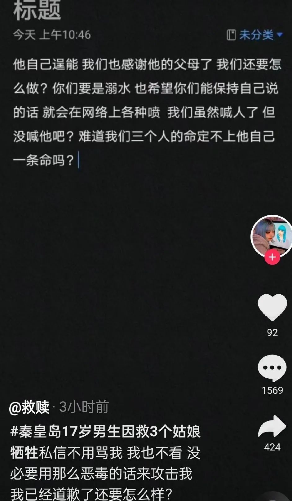 今天(8月10日),有一位自稱是其中一位被救女孩雯雯的哥哥的網友發視頻稱,為女孩的一些**“叛逆話”**道歉,一定盡全力幫助韓家,現在家人所有信息被曝光,求大家適可而止。