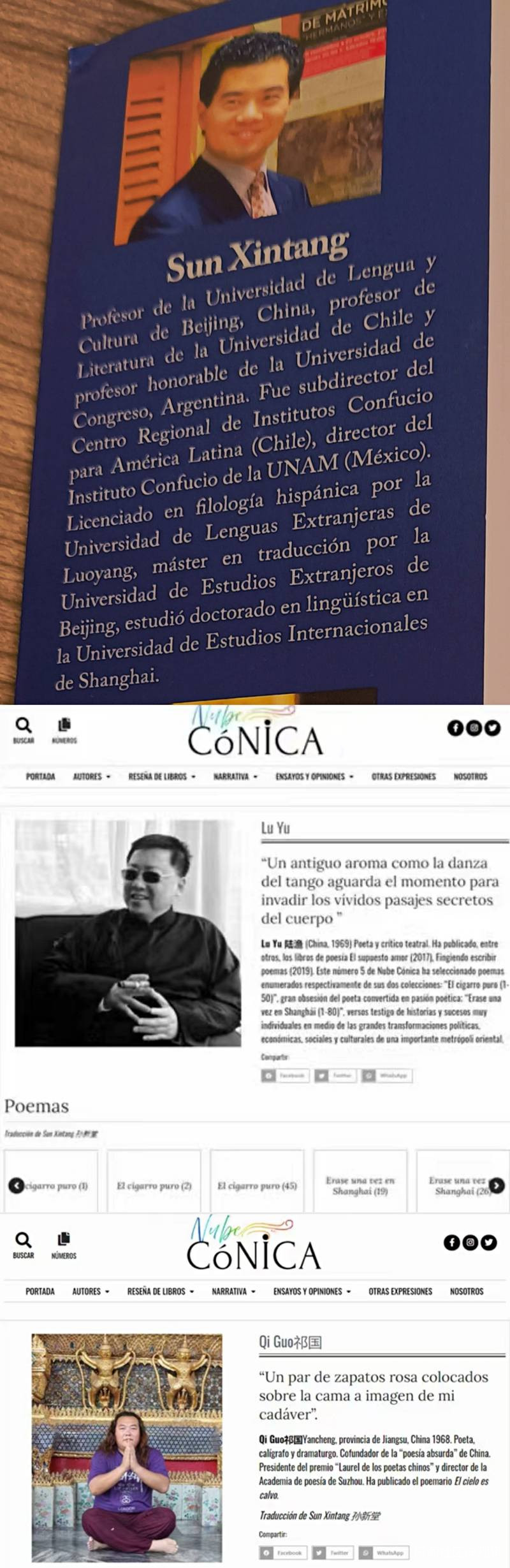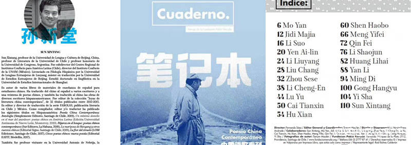孫新堂還介紹了2020年夏,由智利聶魯達基金會(Chile Neruda Foundation)和他一起進行的一項文學交流嘗試,“2020年8月,聶魯達基金會主辦的《筆記本》詩歌雜誌推出了一期‘中國詩歌專刊’,這一期雜誌從頭到尾都是中國當代詩人的作品,是我選譯的,共收錄了20名中國當代詩人的作品,包括諾貝爾文學獎得主莫言 (MOYAN)與秦菲(Fei Qin)。”