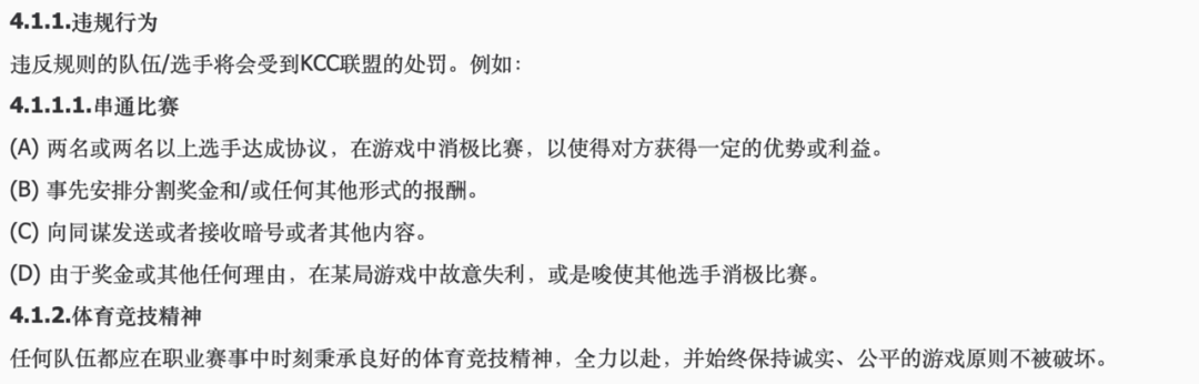 尤其在4.1.1中,詳細舉例了賽場中可能違規的行為。顯而易見,在制定賽事準則時,聯盟對於公平競技非常重視重視,嚴防任何隊伍利用規則漏洞獲得利益。