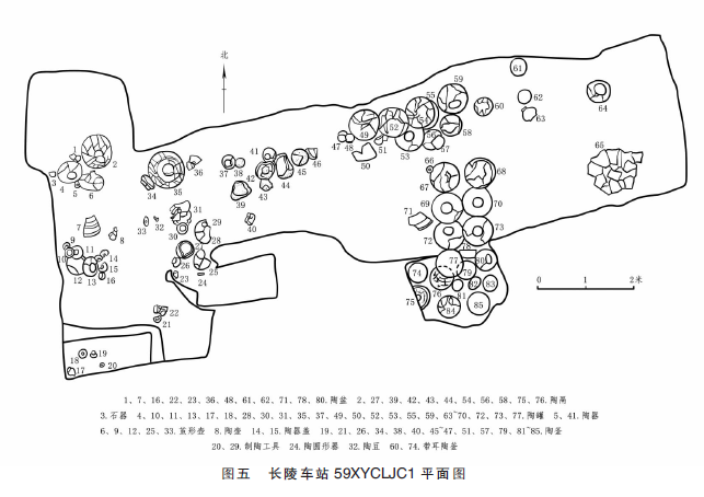 發掘了7個放置陶器窖藏坑,出土了大量的日用陶器和製陶工具。部分窖穴雖然表面看是儲物之用,但具有半地穴房址的一些特點,或許為簡易形式的建築居址、工作棚。例如59XYCLJC1,平面呈不規則的長方形,南北寬2.6—6.6、東西長3.7—14.3、深0.5—1.4米。坑內有規律的排列着甕、罐、釜、盆、繭形壺、鬲、器蓋、豆、器座、陶拍和支墊等幾乎全部完好的陶器共計80餘件。器物大多倒置於土坑中。坑中有一條便於行人的南北向灰土路面,路面寬2.4米(圖五)。路面顯系長期出入踩踏形成。根據其面積、內部結構和存放物品種類等方面分析,與成品儲存甚至銷售環節關係更大。
