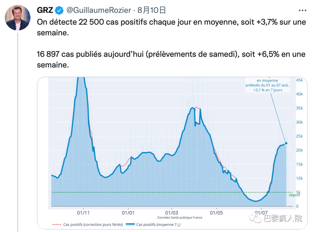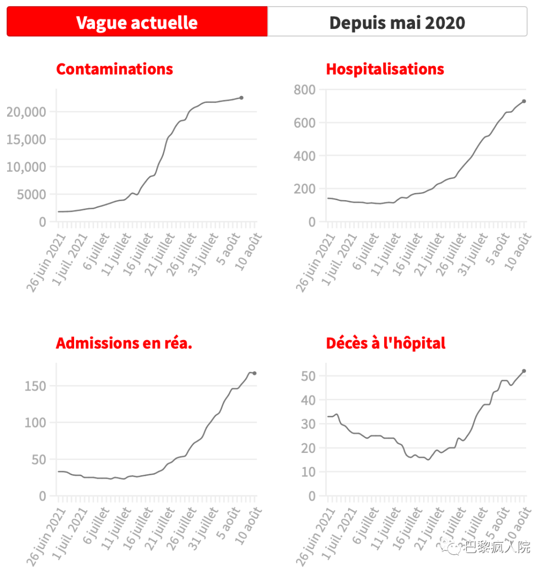 根據Covid Tracker網站報道的法國衞生局的最新數據,在8月1日至7日期間,平均每天新確診22500個病例,在一週時間內增加了3.5%。根據8月10日的數據報告,因新冠住院的人數已經達到9153人,其中1712人目前處於重症監護狀態下。住院治療在七天內增加了14.8%,而同期的搶救治療則增加了28.6%。在8月4日至10日期間,平均每天發生51起與新冠有關的死亡,比前一週多21.8%。