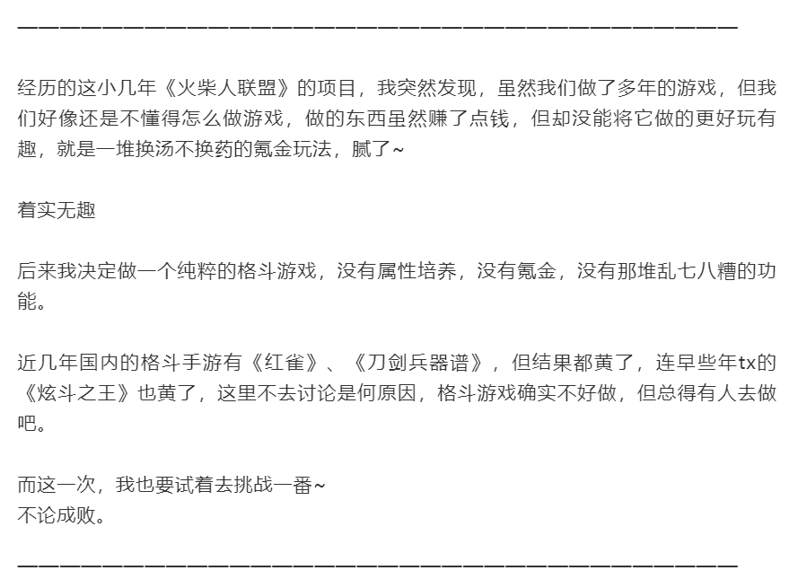 不過鬼人的目標似乎不太一樣。2018年時,他在小號上發佈了一篇招聘啓事,決定投入新項目,“做一個純粹的格鬥遊戲”: