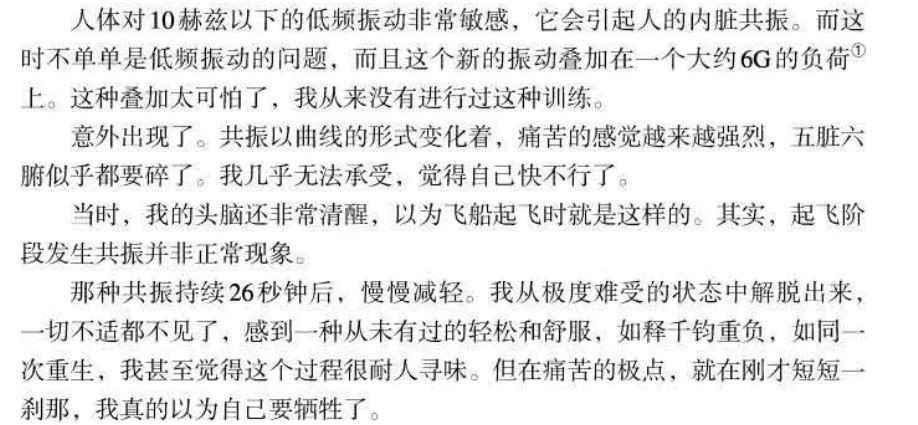 像我國首次載人飛行,火箭升空時就產生了劇烈振動,楊利偉的身體也遭受了極大的痛苦,以為自己要犧牲,而在返回時,着陸的衝擊竟然使小小的話筒也讓楊利偉的嘴角受傷流血,這些在後續的技術設計中都進行了改進,使得後面的航天員不用再遭受這些痛苦。