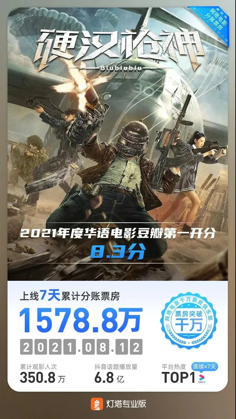 燈塔專業版數據顯示,上線7天《硬漢槍神》,累計分賬票房1578.8萬,累計觀影人次350.8萬,抖音話題播放量6.8億,連續7天居於優酷電影熱度榜首,作為優酷電影暑期檔的開山之作,《硬漢槍神》打了漂亮的一仗。