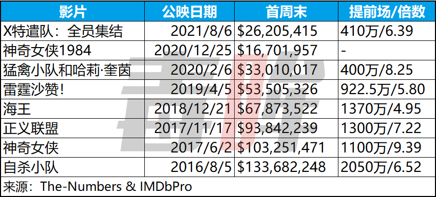 若從提前場與首週末的對比來看,近期“DC電影宇宙”電影呈現出一定的規律性。除了未公佈數據的《神奇女俠1984》外,此前6部作品的提前場和首週末票房的倍數在4.95至9.39之間。而《X特遣隊》在提前場進賬410萬美元,與首週末票房的比值為6.39,正好落在上述區間中段。