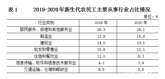調查樣本中,2020年就業人數前五位的行業與上年一致,依次為居民服務、修理和其他服務業,製造業,建築業,批發和零售業,住宿和餐飲業,共吸納67.2%的新生代農民工就業。