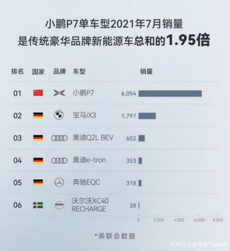 以中國“造車新勢力”之一的小鵬P7為例,該車型銷量驚人,比傳統豪華品牌新能源車的總銷量還高,達到後者的1.95倍。