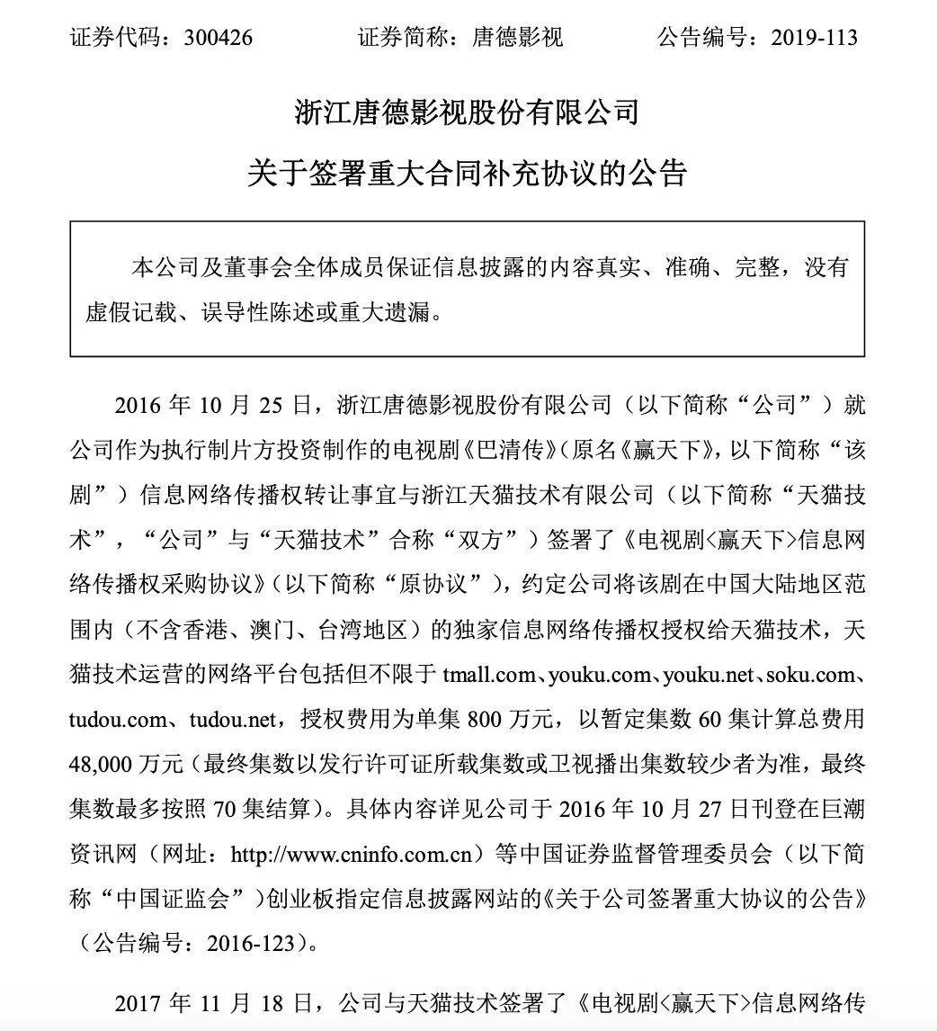三年來,唐德因為《巴清傳》的“撕扯”每隔一段就能登上熱搜,2019年又傳出將再支付6000萬給男主女主“換頭”重拍,到目前該劇播出時間仍然遙遙無期。作為投資方,唐德影視為此遭受重創,連續三年虧損,市值從最高峯的150億跌至25.34億,徘徊在退市邊緣。主演明星一旦出事,對一家上市公司的打擊可謂是毀滅性的。