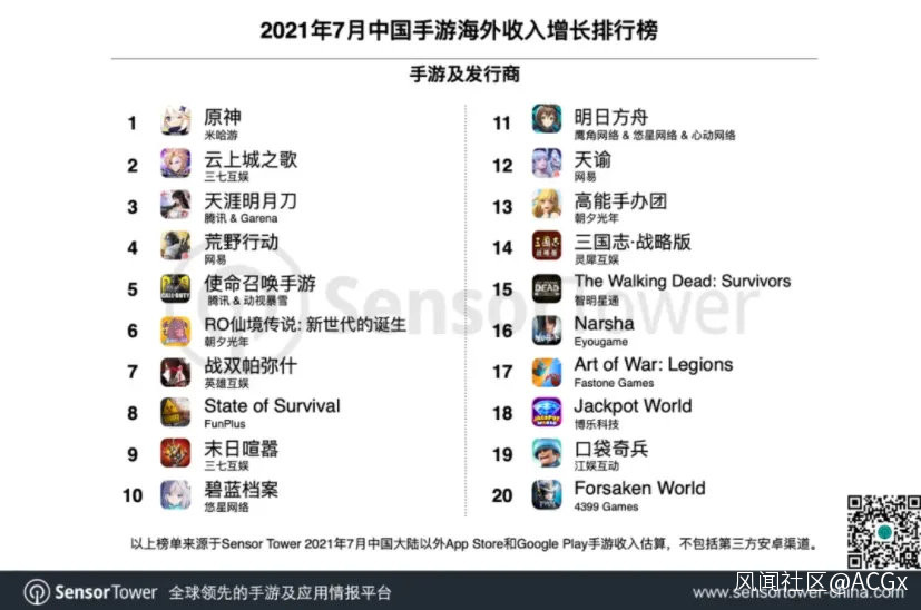 另外,根據Sensor Tower7月發佈的成功出海的中國手遊TOP30中可以看到,《原神》在日韓、歐美市場所取得的開創性成果,正激勵着更多中國產泛二次元手游出海,成為本期收入增長榜單的新主力。其中,朝夕光年於6月在東南亞市場發行的《RO仙境傳説:新世代的誕生》,三七互娛於7月在韓國市場發行的二次元冒險手遊《雲上城之歌》等登上了TOP30的榜單,而英雄互娛發行的《戰雙帕彌什》、悠星網絡發行的《碧藍檔案》和朝夕光年發行的《高能手辦團》都位列7月收入增長榜單,使得榜單中泛二次元手遊多達7款。