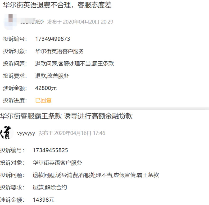 這些問題從來不是個例,在各大投訴平台上,有上百條關於華爾街英語的投訴信息,投訴內容大多為退款問題、霸王條款、誘導貸款、課程一般、服務差等。