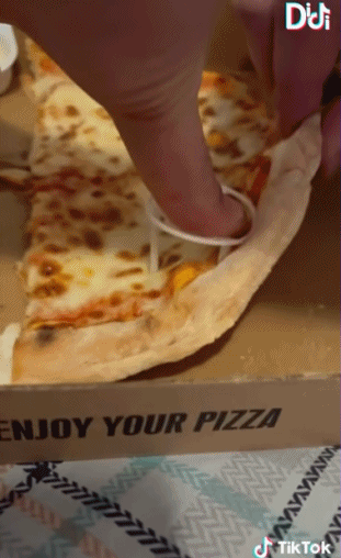 有網友把用於固定外送的披薩盒的白色塑料架子,用來扯下一片披薩,