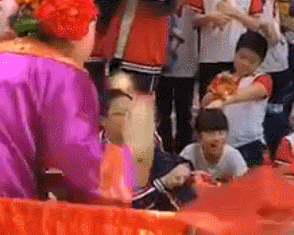 噔。一記鑼響,花車禮炮平地一聲雷,硝煙中漸漸顯現一個矮娃娃,戴着奴才帽,一邊跳着魔鬼的步伐一邊揮舞鞭子,謂之“開道”。