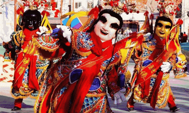 人們頂着竹篾編制的頭套,扮成各種神偶。神偶也有門道,按照福州當地方言,大的叫大神翁,比如一些耳熟能詳的武將,二郎神、千里眼順風耳等,以及黑白無常裏的黑無常。小的叫童仔,頭套重量較輕,手腳靈活,因此經常充當觀眾席氣氛組,比如台灣知名街頭藝人電音三太子,土地公等。