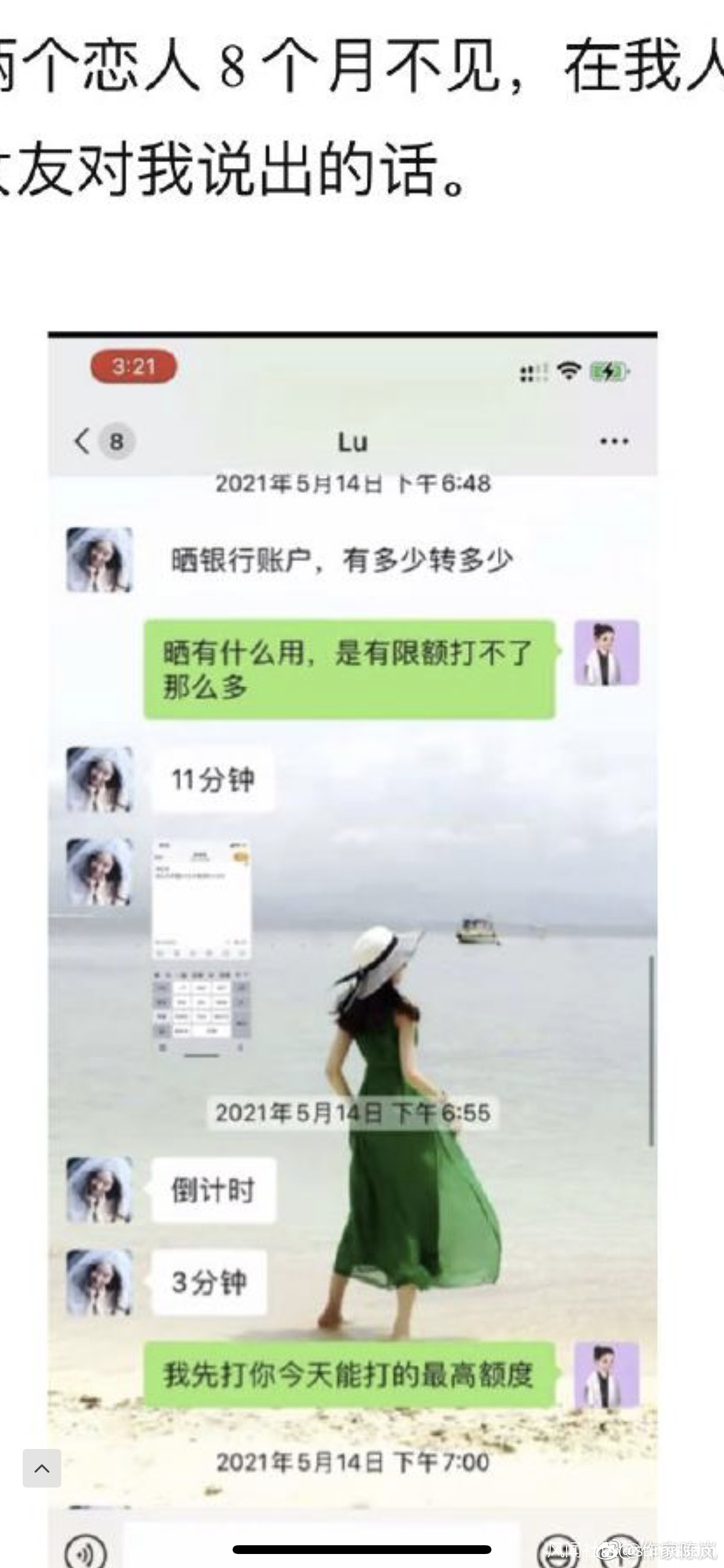 並在次日2021年5月14日,發消息勒令霍曬出自己銀行卡賬户餘額,然後全部轉給她。