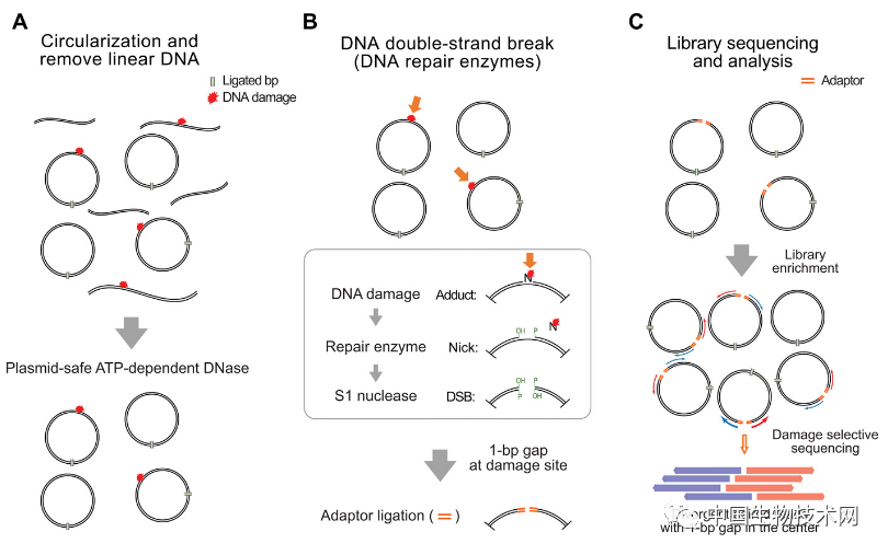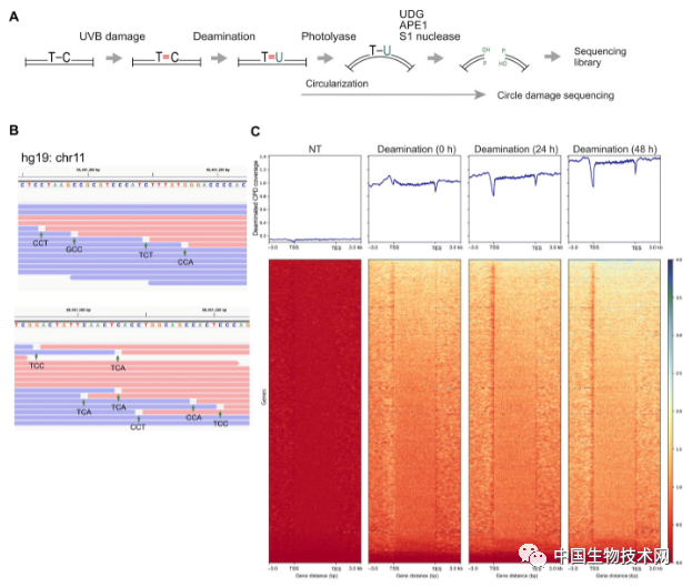 為了在全基因組範圍內單鹼基水平上繪製出CPD,研究人員開發了一種環式損傷測序(circle-damage-seq)的方法。