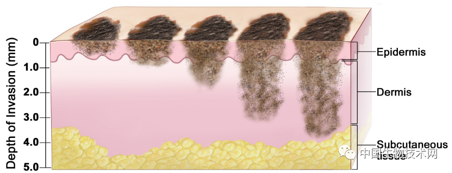 黑色素瘤的侵襲(從表皮、真皮到皮下組織)