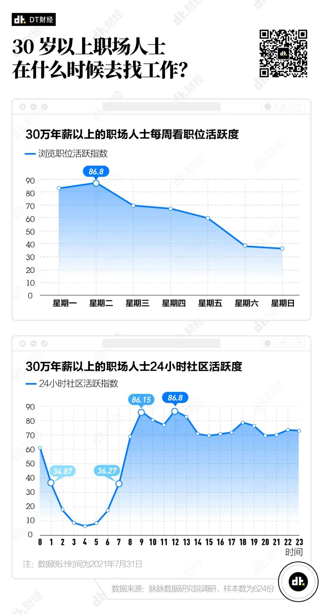 而脈脈的數據顯示,每週二是30萬年薪以上的職場人士最常登陸各大求職APP找工作的時候。