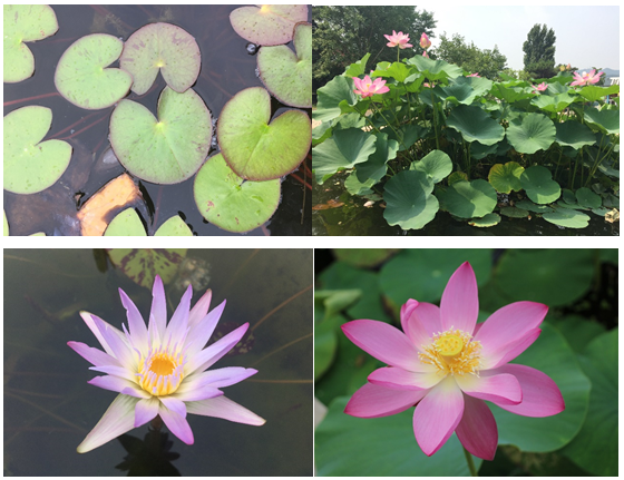 睡蓮和蓮形態差異非常顯著,最簡單的是從葉片和花上來進行區分。首先是葉片,睡蓮是浮水植物,葉片常漂浮在水面上,且葉片帶有“V”形缺刻,而蓮屬於挺水植物,葉片挺出水面,葉片也沒有缺刻;睡蓮花中央的柱頭盤凹陷,且花色豐富,而蓮花中央有凸起的蓮蓬,花色不具有藍/藍紫色。
