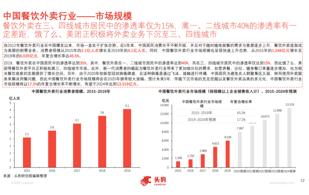另一方面,目前餐飲外賣在一二線城市的滲透率為40%,而在三四線城市的滲透率只有15%。據《報告》預計,未來伴隨下沉市場的挖掘以及餐飲外賣品類多元化,中國餐飲外賣行業市場規模有望於2024年達到13319億元。
