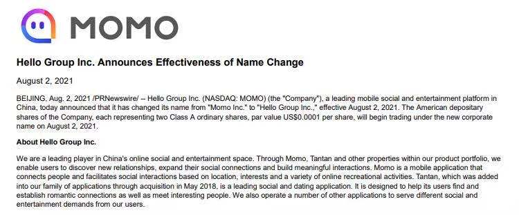 在十週年之際,陌陌科技宣佈公司法定名稱從“Momo Inc.”更改為“Hello Group Inc.”。公告顯示,陌陌此次更名僅僅更改其英文名稱,中文名稱陌陌科技並無變動。其旗下APP名稱也暫無變化。