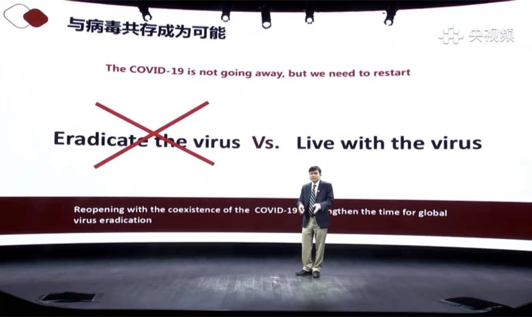 “今年,滅絕病毒不可能,我們唯一的選項是與病毒共存……只不過有些國家病毒要高一點,有些國家病毒要低一點(如中國)。我們如何去跟病毒共存,採取如何的策略,全球的策略做法不一樣。(比如中國要幫助其他國家、防止疫情反撲等等)”