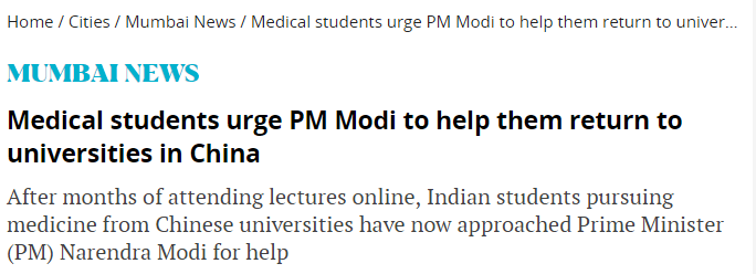 在中國學習醫學的25000名印度留學生甚至要求莫迪出手幫助留學生返華。