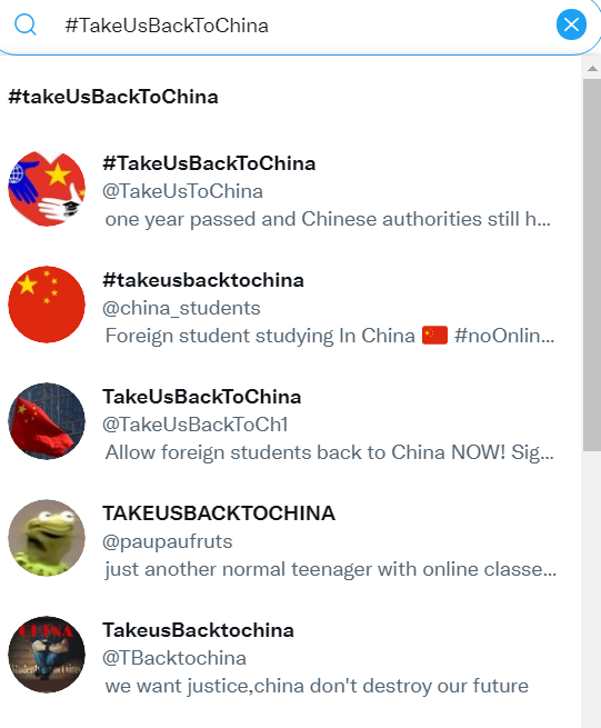 很多在疫情爆發時離開中國的外國留學生也一直在發起**#takeusbacktochina**的話題,認為中國嚴格的防疫政策阻擋了他們求學的步伐,呼籲中國政府打開國門。