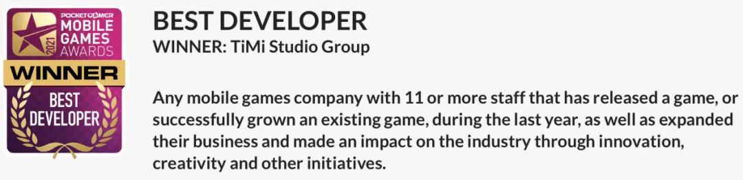 第一,憑藉CoDM,天美在海外遊戲圈打出了名頭——除了TGA最佳移動遊戲,由海外遊戲媒體Pocket Gamer主辦的移動遊戲大獎(Mobile Games Awards)也連續兩年把最佳開發者獎項頒給了天美,而以往曾經獲得過這一獎項的廠商包括Supercell和Epic Games。