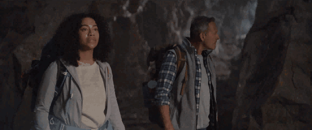 兩人小心翼翼地走進洞內探索,父親不時提醒女兒注意腳下。