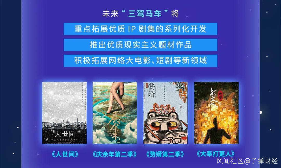 在電視劇方面,相繼推出了《贅婿》、《斗羅大陸》和《叛逆者》等優質熱播劇,其中由騰訊影業-新麗傳媒-閲文影視這“三駕馬車”出品的《贅婿》更是今年現象級爆款。此外,“三駕馬車”還推出了慶祝建黨一百週年電影《1921》,這也是“三駕馬車”時代旋律三部曲中的第一部,後兩部《人世間》《心居》也將陸續上線。
