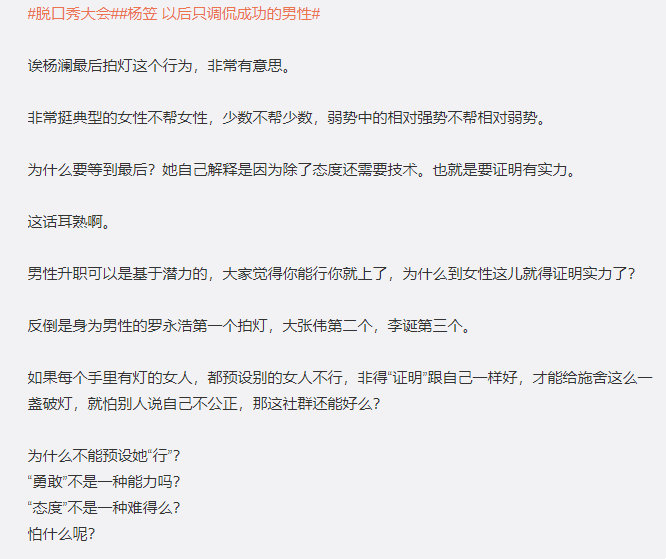 很多女生覺得楊瀾不好,爹味重,你們真是沒看懂啊,真正在救場的是楊瀾。她也有這個資格,因為她是女性,在當時情況下男性如果説楊笠的內容還得聽聽內容再鼓掌,立場其實很危險。