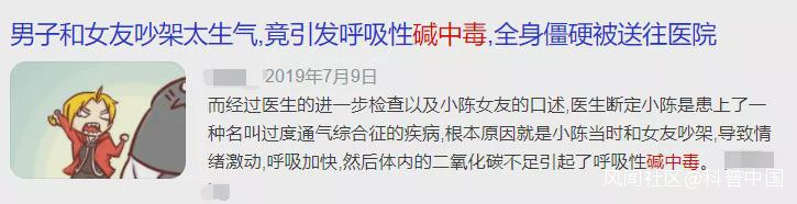 武漢一男子兩週前因意外摔傷導致骨折,治療時花了很多錢,還影響了工作,這讓“上有老下有小”的他倍感壓力。8月13日,他突然出現狂躁、抽搐、出冷汗等情況。據報道,他是因為過度焦慮,連日嘆氣,導致了呼吸性鹼中毒。初聽聞這則新聞大家肯定很好奇,骨折手術做完了,也很成功,怎麼會突然出現抽搐、狂躁的症狀。他患的呼吸性鹼中毒是什麼?為什麼會中毒?有什麼危害?別嘆氣,快來看。#1 什麼是鹼中毒?正常情況下,人體血液的酸鹼度是維持在一個相對穩定的狀態,血液PH穩定在7.35-7.45,這種穩定稱為酸鹼平衡。當血液PH大於7.45時稱為鹼中毒。#2 為什麼會出現鹼中毒?鹼中毒分為呼吸性鹼中毒及代謝性鹼中毒。呼吸性鹼中毒肺過度通氣引起動脈血中二氧化碳減少,導致血液PH高於7.45出現呼吸性鹼中毒。常見原因包括:1. 精神性過度通氣精神緊張、焦慮、害怕,氣喘吁吁、吵架、情緒激動等情況會導致人體過度通氣,呼出大量二氧化碳,引發呼吸性鹼中毒,此種類型就是新聞中患者突然出現狂躁、抽搐的原因。2. 低氧血癥機體缺氧時會出現過度通氣,是機體對缺氧的一種代償性保護,會造成二氧化碳排出過多從而導致鹼中毒。此類型常見於突然進入缺氧環境如高原、高空等環境中。