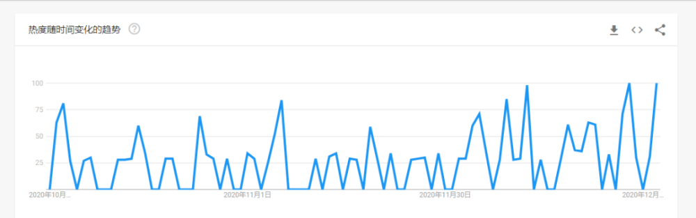 搜索谷歌趨勢,可以發現空氣煎鍋在過去三個月的搜索情況,直到2020年12月,該產品的搜索熱度依然只增不減,可以預見的是,在接下來的一段時間內,這個產品的搜索熱度還會很高。