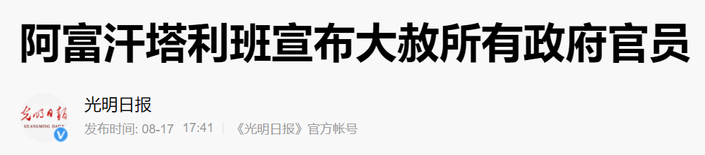 8月15日,塔利班新聞發言人納伊姆公開宣佈:在阿富汗的戰爭已經結束!納伊姆還表示,塔利班已經準備好與阿富汗各方人員進行對話,並將保證他們將得到必要的保護,納伊姆稱,塔利班希望與所有人和平相處。