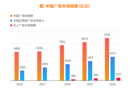2021年,紅人不僅入選了國家的新職業,新國貨消費品牌也在這樣的勢頭下蓬勃發展。據《2021中國紅人新經濟發展報告》,2020年傳統廣告行業經營額同比增速僅為5.4%,而紅人營銷增長率高達50%!
