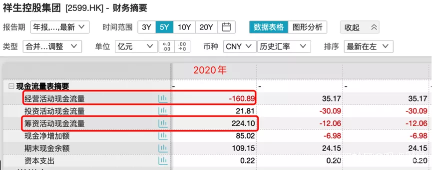 而且整個2020年祥生的經營性現金流淨額為-160.89億元,同比減少557%。同期因融資借款產生的籌資性現金流淨額則高達224.1億元,同比增長1958%。