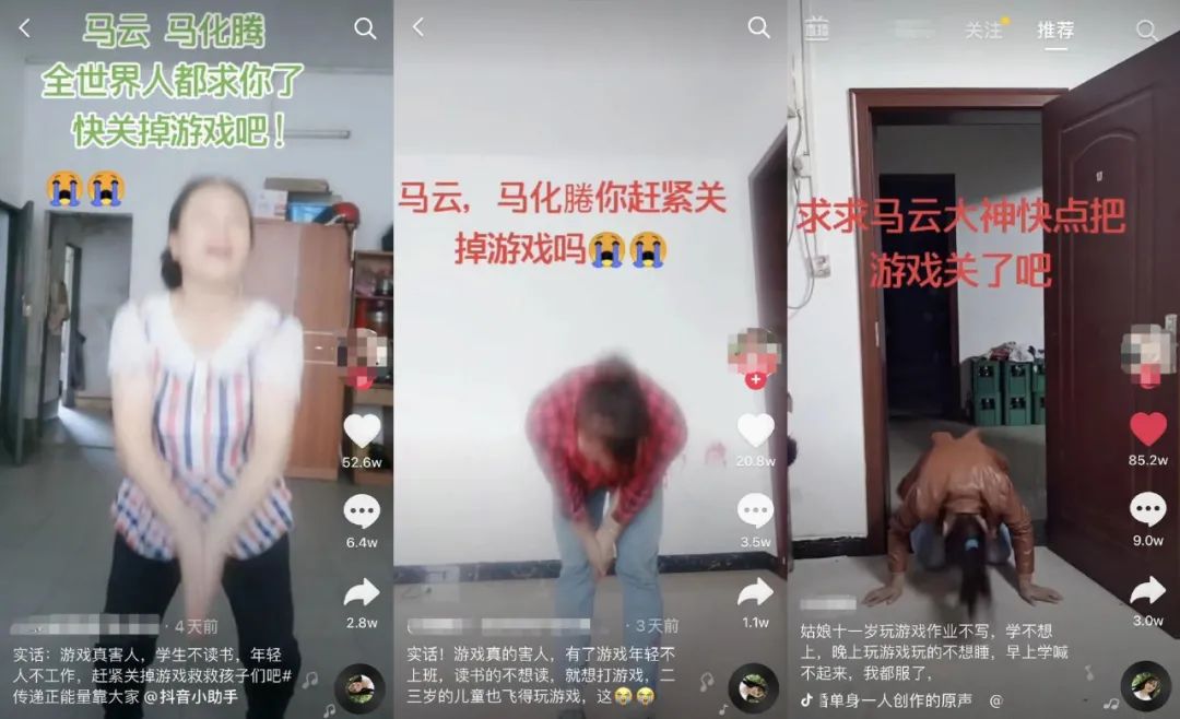 他們只能在短視頻平台上向馬雲、馬化騰等“遊戲大佬”哭訴,為了下一代,關掉遊戲服務器,讓孩子們不再上癮。