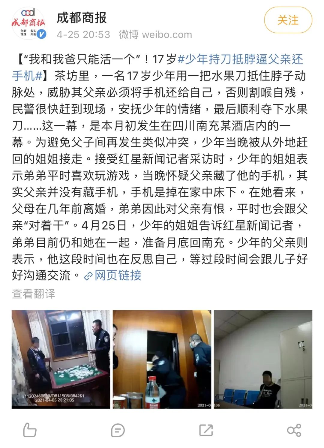 四川南充的一位少年,為了能玩遊戲,不惜持刀威脅沒收手機的父母,説“我和我爸只能活一個”。