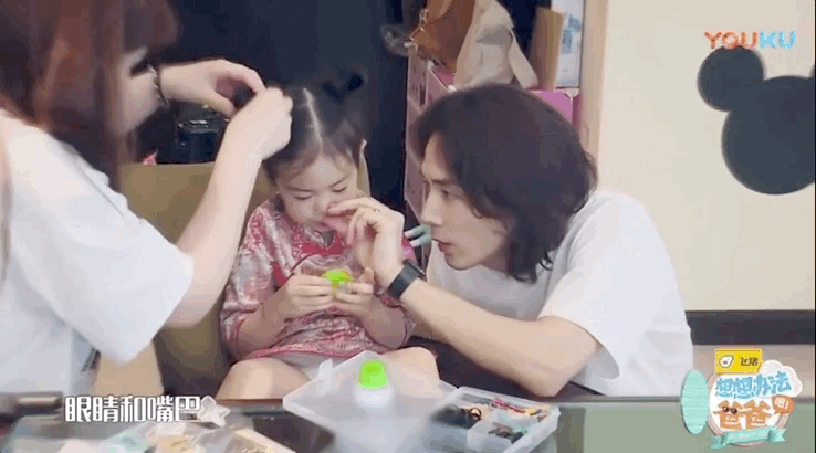 他會耐心給Lucky整理化妝包,會蹲下來温柔地誇她,「你跟媽媽一樣漂亮。」