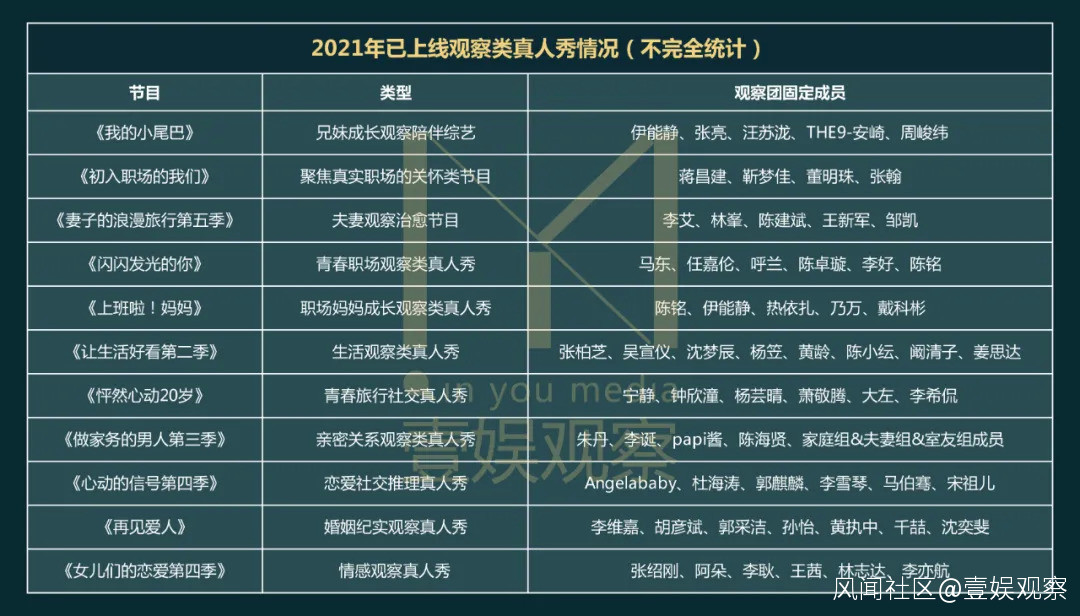 儘管開年的偶像選秀拿下綜藝市場絕對關注度,到了年中,《披荊斬棘的哥哥》又以“不油膩”“爺青回”在暑期檔後半段來勢洶洶,使得2021年綜藝市場關鍵詞仍與選秀、舞台競演分不開關係,但遍佈其中,觀察類真人秀仍在持續不斷地輸出,成為每個平台、每一季度都能被看到的綜藝品類。