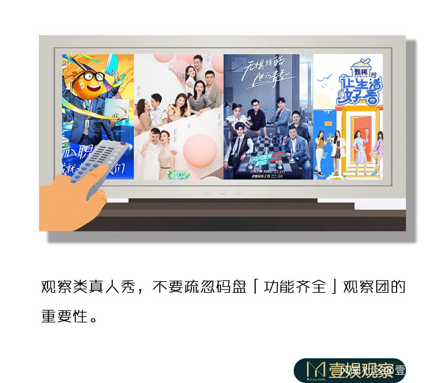 當節目的形式以及被觀察的領域在逐漸相似,觀眾對此不再新鮮的時候,“主角”的真人秀、“配角”的觀察團就更成為了該類型節目的制勝關鍵。