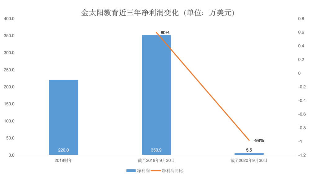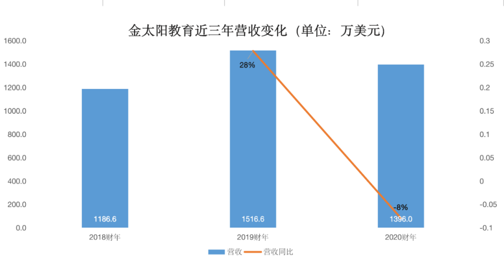 總體而言,金太陽整體的規模並不大。近三個財年,金太陽總營收4099萬美元(2.66億元人民幣)。其中,2019財年,金太陽教育營收1516.6萬美元,同比增長28%。2020財年,受疫情影響,營收1396萬美元,同比減少8%。