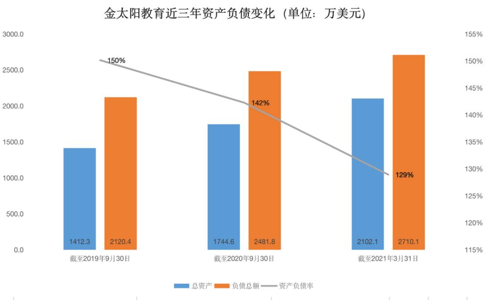 負債率可能透露了一部分信息。近三個財年,金太陽教育的資產負債率分別為150%、142%、129%。雖然持續優化,但仍然處於高位。