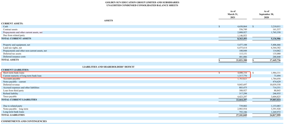 銀行借款等其他負債問題則不容忽視。截至2021年3月31日止,金太陽教育的短期銀行貸款和長期銀行貸款當期部分金額共計592.39萬美元,佔流動負債總額的26%。