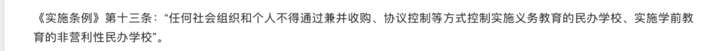 根據《民辦教育促進法實施條例》第十三條,任何社會組織和個人不得通過兼併收購、協議控制等方式控制實施義務教育的民辦學校、實施學前教育的非營利性民辦學校。