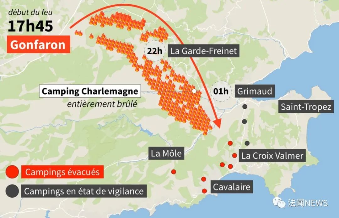 據瓦爾省稱,火災是在週一下午5點45分左右在Gonfaron鎮開始的,火焰“由於乾燥和風而迅速蔓延”。據當地政府稱,大火在晚上10點左右到達了Garde-Freinet村莊上方的山脊。根據凌晨1點的報告,“火勢非常迅速地朝la Garde-Freinet、Grimaud,然後朝la Môle移動”。幾個營地隨後被疏散,包括在凌晨2點被徹底燒燬的Charlemagne營地。