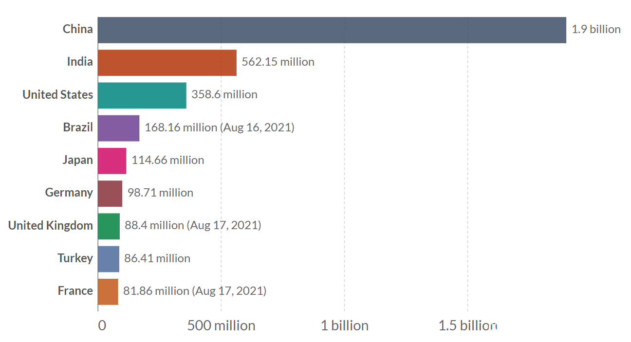 截止2021年8月18日,印度累計接種5.6215****億劑,列第二位,**其中單日新增接種563萬劑。**印度至少接種一劑的人羣佔比為31.7%,完成接種的人羣佔比為9.0%。印度每百人累計接種40.74劑,是中國的30.3%。