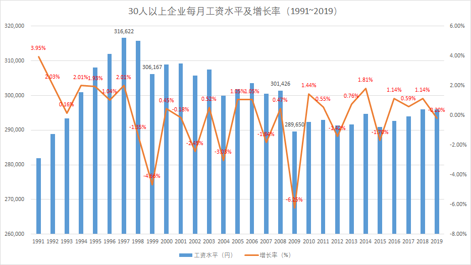 另一方面,即使艱難地從千軍萬馬中殺出重圍,新入職的社畜依然要面對慘淡的工資現實。在工資上,儘管新一代的年輕人們已經在工資水平上超越了自己的父輩,但沒有了顯著增長,反而在30萬日元的前後左右橫跳。